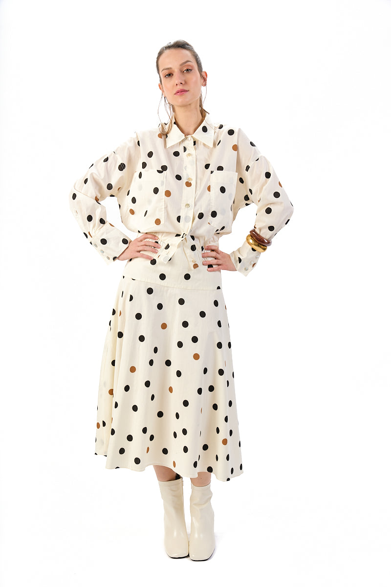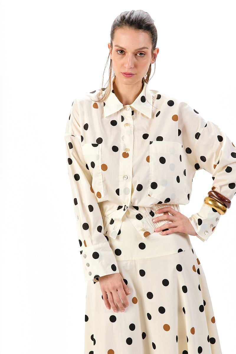Zwei große, aufgesetzte Taschen auf dem Vorderteil setzen einen funktionalen Akzent und betonen die klare Linienführung. Die durchgehende Knopfleiste erlaubt vielfältige Styling-Möglichkeiten – offen getragen als leichte Jacke oder geschlossen als markante Bluse. Lange Ärmel mit breiter Manschette runden das Design detailstark ab.