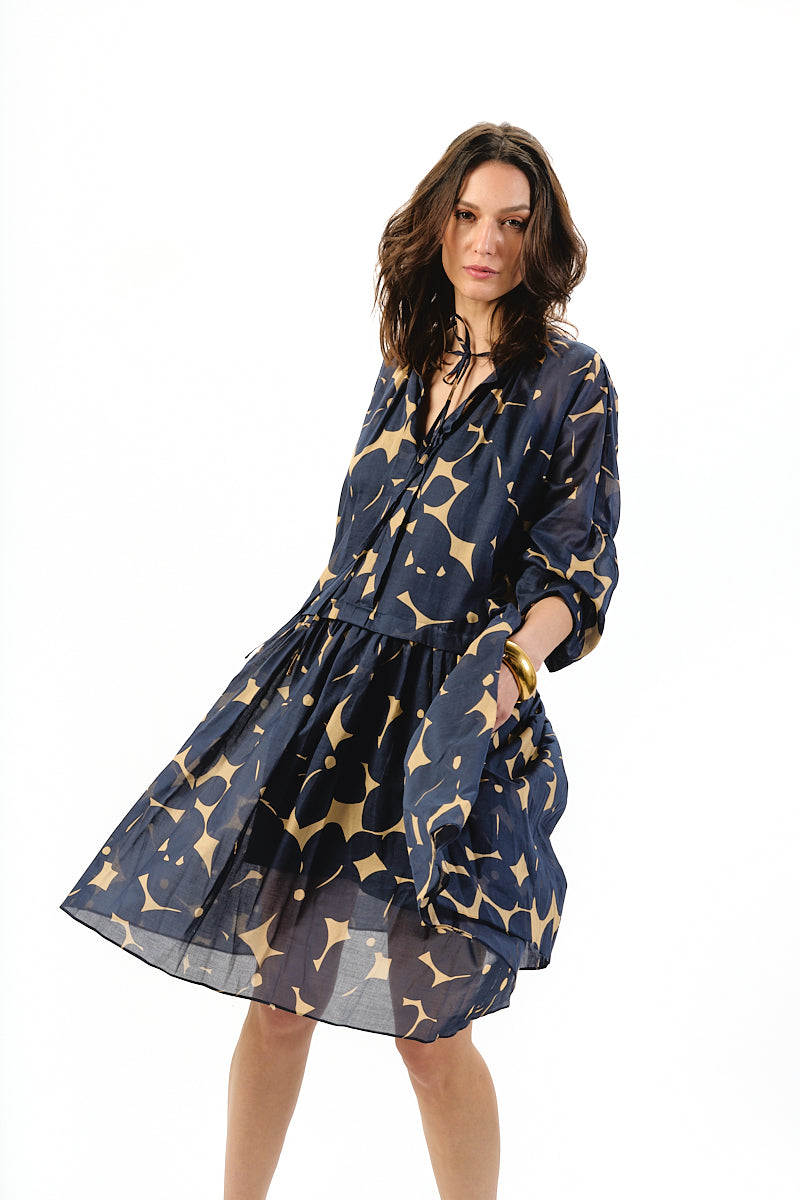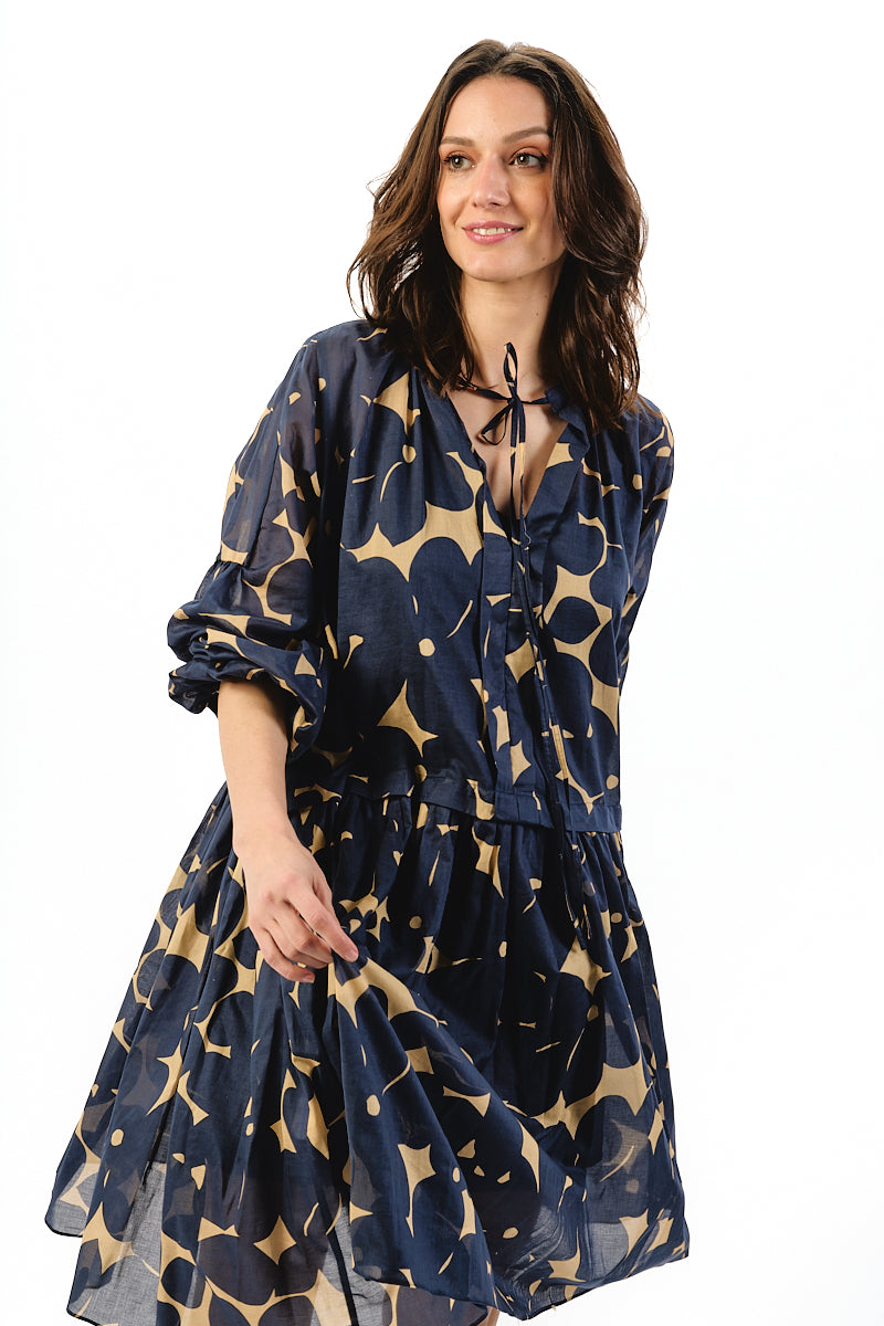 Der V-Ausschnitt mit zartem Bindeband betont dezent das Dekolleté und lässt sich je nach Anlass offen oder gebunden tragen. Der lange Ärmel mit elastischem schmalem Bündchen lässt sich ganz einfach schoppen. Dann unterstreichen Dreiviertelärmel den luftigen Charakter und machen das Kleid zum idealen Begleiter für warme Tage – ob beim Stadtbummel, im Büro oder auf sommerlichen Events.