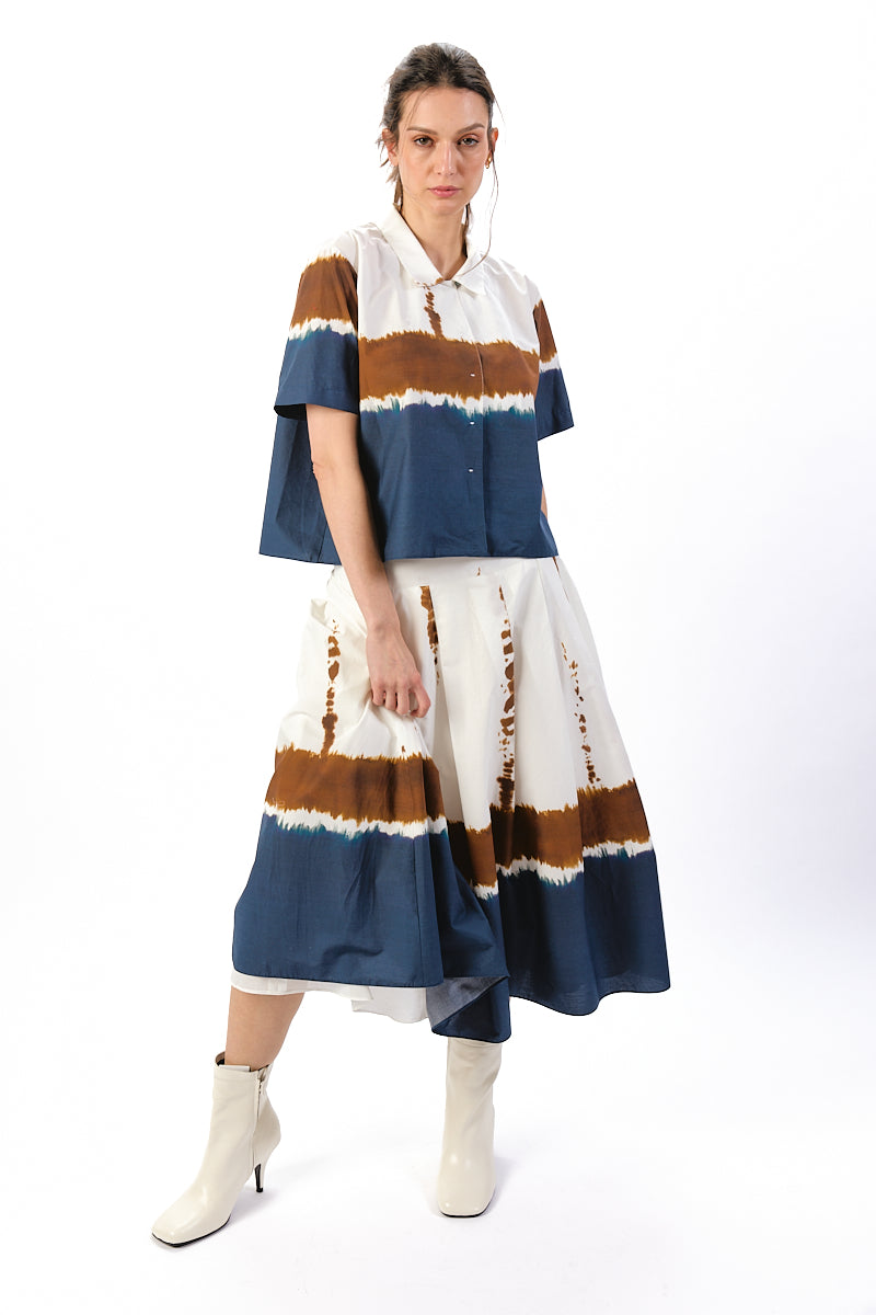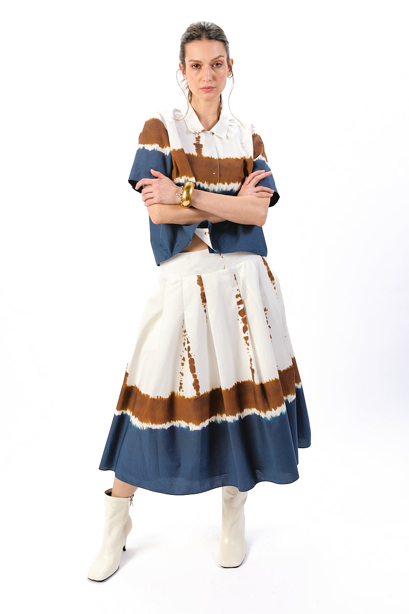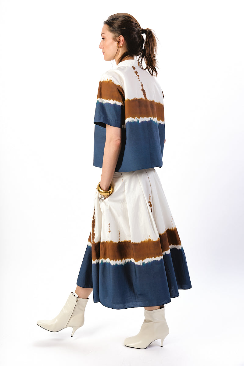 Grundton Ecru mit Batikdetails in Blau und Hellbraun – jeder Rock ist durch das Muster ein Unikat.